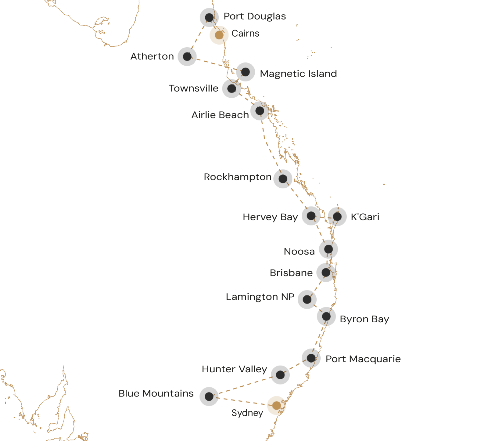 Uw reis begint in de iconische wereldstad Sydney met vele bezienswaardigheden. Vervolgens ontdekt u het natuurgebied de Blue Mountains, de wijnregio Hunter Valley en wandelt u door Lamington National Park. Ook brengt u een bezoek aan de verrassende stad Brisbane. Daarna zijn blauwe wateren en goudkleurige stranden aan de orde van de dag. U verblijft een nacht op het grootste zandeiland ter wereld, K'Gari en verkent vervolgens het Great Barrier Reef vanuit Airlie Beach en Port Douglas. Ook ontdekt u de prachtige natuur van Atherton Tablelands. De Australische oostkust is adembenemend mooi!